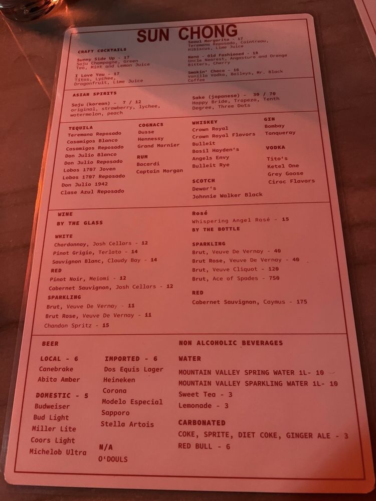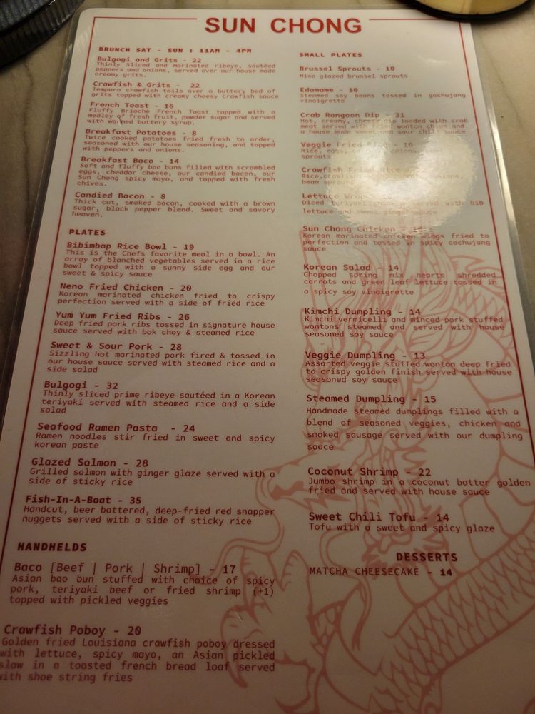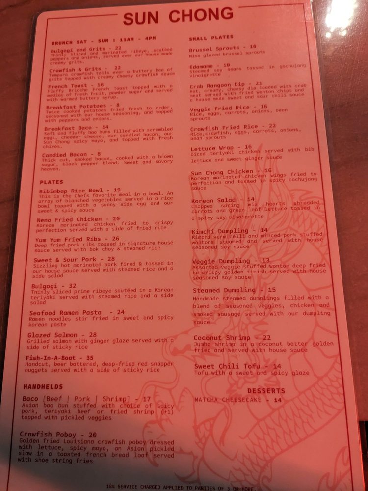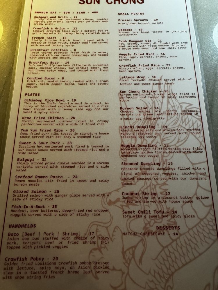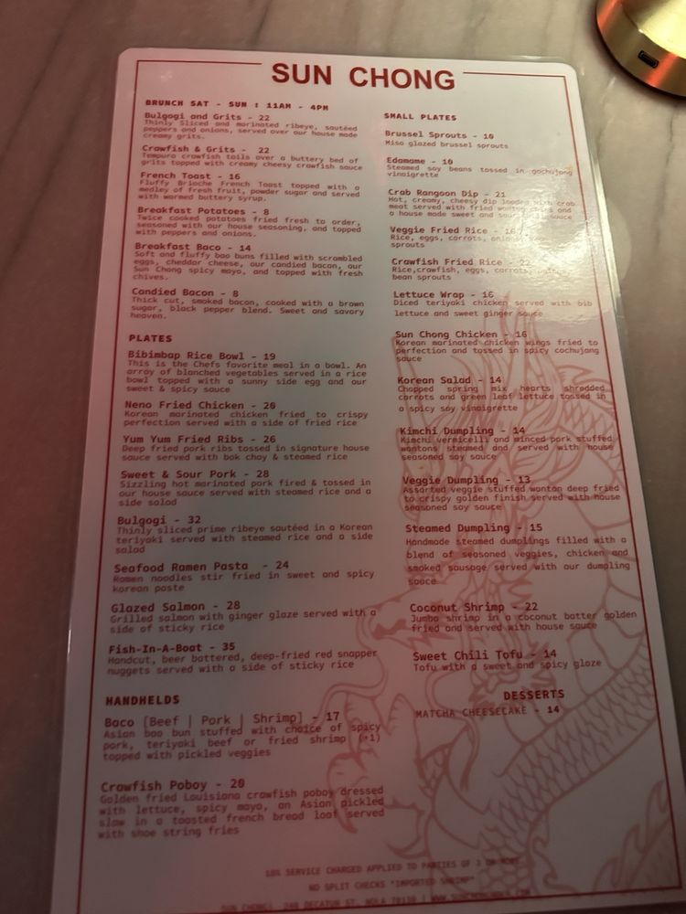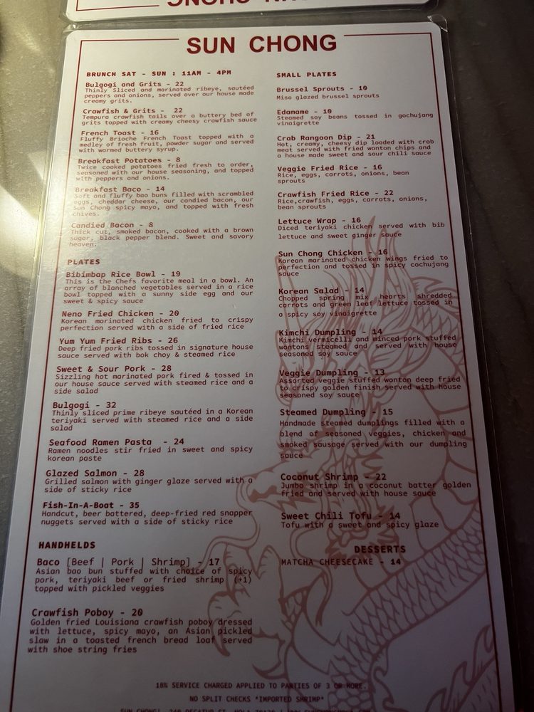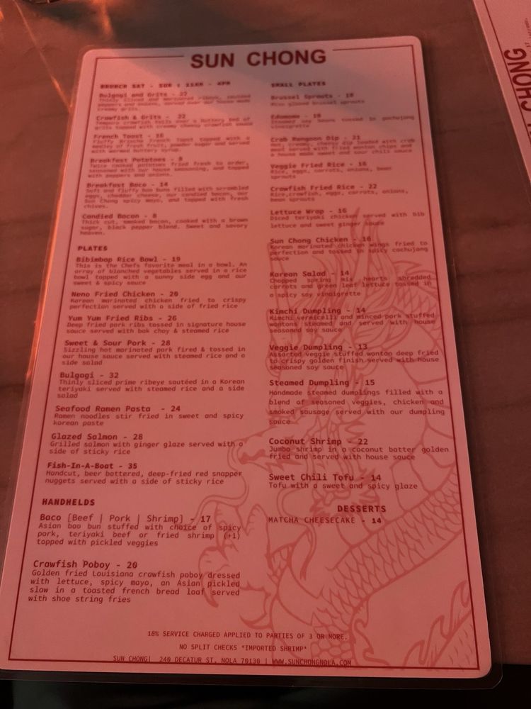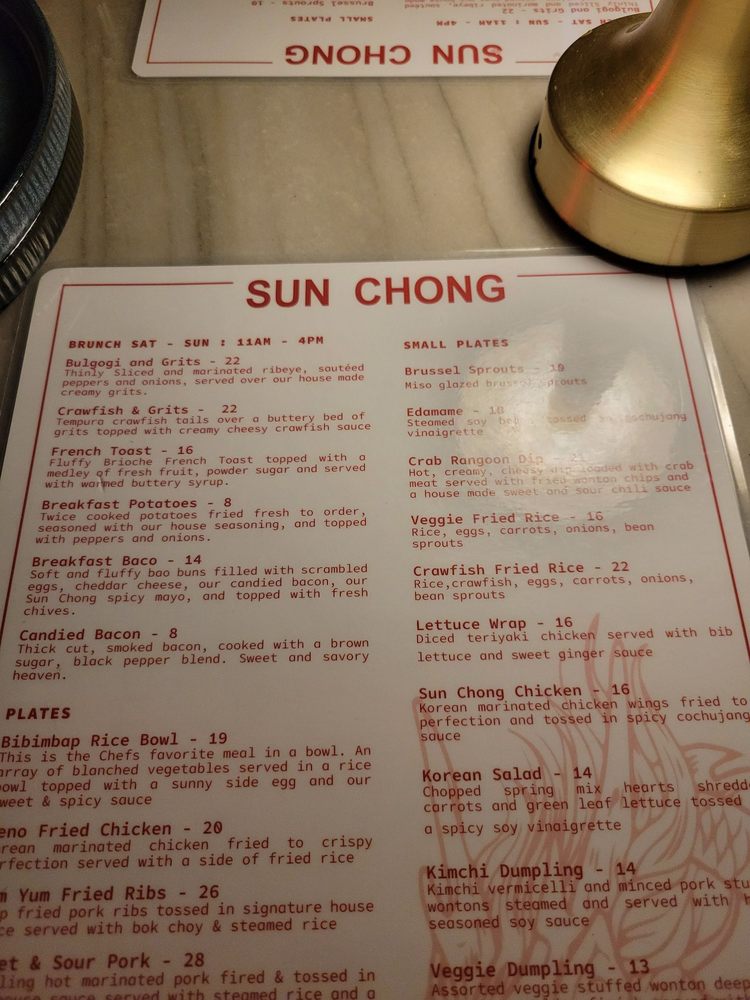Introducing the menu at Sun Chong, a Korean restaurant in New Orleans, offers a range of small plates, handhelds, and big plates with unique flavors and options. From Crawfish Fried Rice to Bulgolgi Poboy, the menu caters to various tastes with vegan and limited vegetarian choices available. The atmosphere at Sun Chong is described as hipster, casual, romantic, and classy, making it suitable for different occasions. Customers praise the quick seating, accommodating staff, and delicious food, with standout items like the teriyaki bao buns and Neno Fried Chicken receiving high praises. Overall, Sun Chong delivers a memorable dining experience with impeccable service and a welcoming ambiance that keeps customers coming back for more.